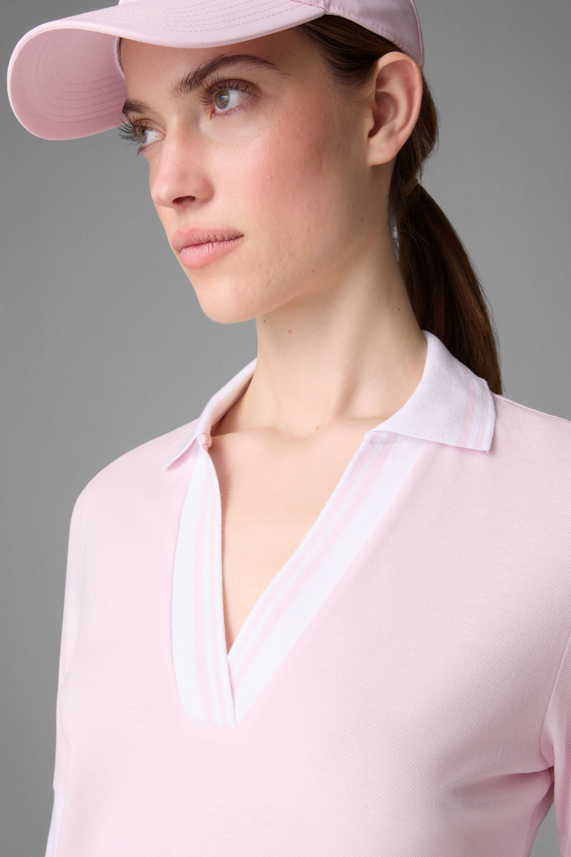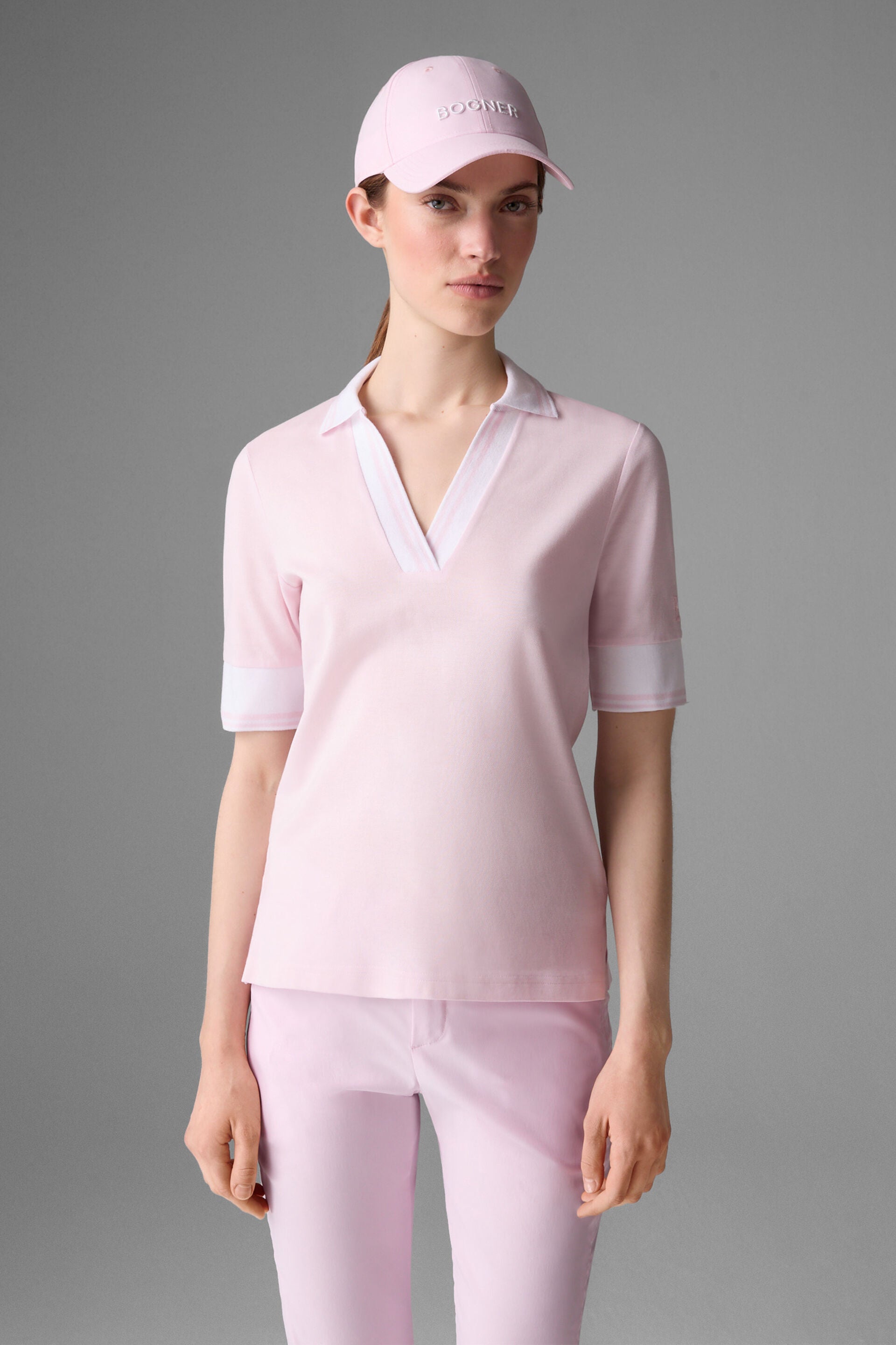 With both a polo collar and plunging V-neck, the Elonie polo shirt combines a high-performance vibe with a feminine look. The ribbing details with contrasting stripes and side slits in the hem make it a sophisticated attention-getter. It boasts a blend of cotton and lyocell in piqué texture for a comfortable finish.